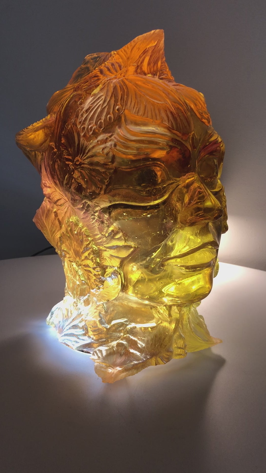 This glass sculpture, titled Butterflies and Orchids, depicts a woman’s bust adorned with butterfly wings, orchid petals representing an individual's chrysalis into a flowering consciousness. The figure is covered in an array of stunningly intricate details which compliment the woman's delicate features to stunning effect. The orchid petals are carefully crafted in shades of yellow, orange and pink, while the butterfly wings show off a delightful pale pink hue. The wings delicately wrap around the figure, providing an overall surreal and romantic vision. The chrysalis shape is sleek and eye-catching, adding a unique element to the sculpture, while the strategically placed details bring even more life and energy to the piece. This thoughtful representation of a woman’s beauty, with its combination of vibrant color and intricate detail, makes this glass sculpture a truly captivating piece.